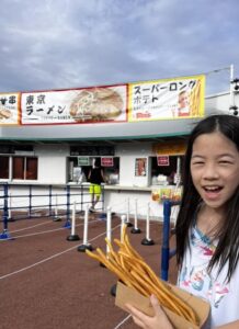 ブルブル震えながら、何か温かいものを食べたい…そう思っていると目の前にはラーメンが売っているではないですか!絶対美味しいに決まっていると思えるのは、体が水分を欲しているし、汗もかいているから塩も欲しい…。食べたいと思ったけど、子供が絶対ポテトがいいというので、結局ポテトになりましたが(苦笑)。塩たっぷりのロングポテト、思いのほかめちゃ美味しかったです!いつもだったら油っぽすぎると思える感じのポテトが逆にカロリー高目でいい感じでした。何より、行儀悪いけど、ロングすぎて、遊びながら食べるっていう、忘れられない楽しい思い出もできました(笑)。